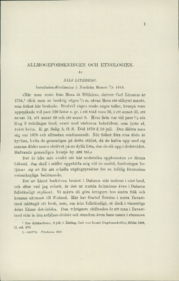 Allmogeforskningen och etnologien: Installationsföreläsning å Nordiska museet 7/5 1919