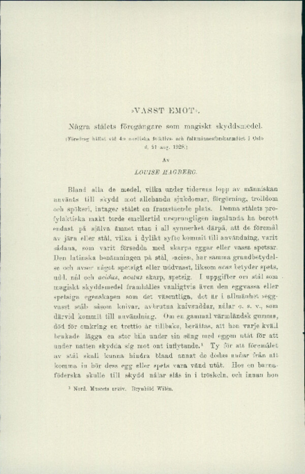 Vasst emot : Några stålets föregångare som magiskt skyddsmedel: (Föredrag hållet vid 4:e nordiska folklivs- och folkminnesforskarmötet i Oslo d. 21 aug. 1928.)