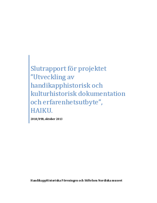 Slutrapport för projektet ”Utveckling av handikapphistorisk och kulturhistorisk dokumentation och erfarenhetsutbyte” , HAIKU