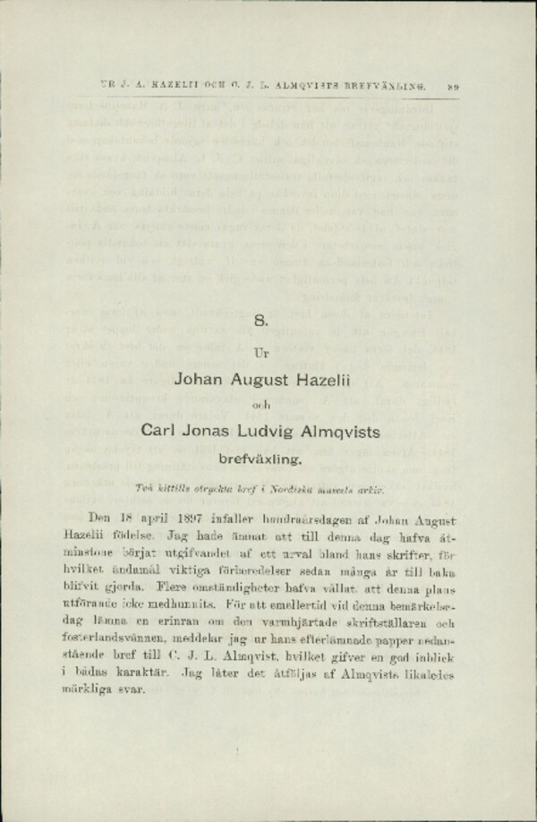 Ur J A Hazelii och CJL Almqvists brefväxling